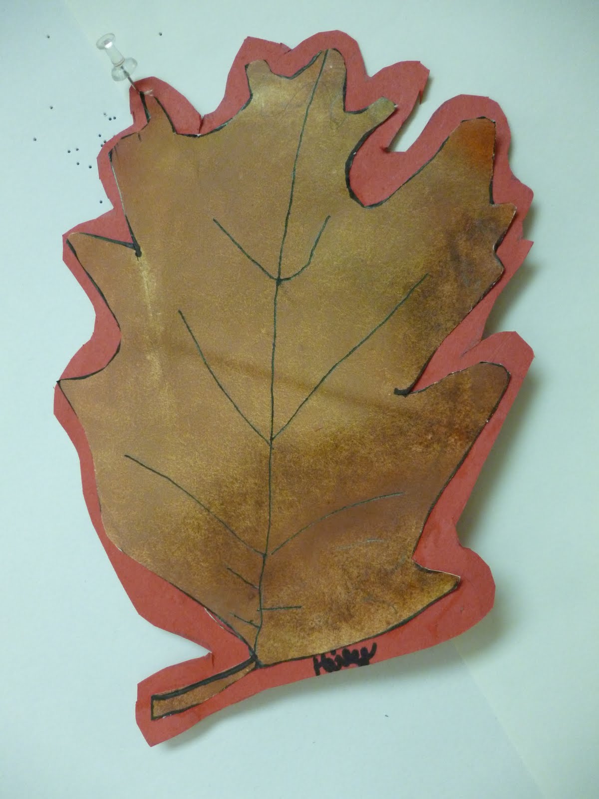 I Love this one... The student mixed all of her colors together and ended up with an extremely brown leaf as I had warned the students. When the students walked in I handed them a leaf to draw from. This students ended up with an oak leaf and I don't think it could have worked out any better for her. The leaf is probably the most realistic fall leaf color (realistically dead). She was upset until I had brought her in a real oak leaf that had been on the ground probably for a week... all the students crowded around and told her how much the leaf looked like the real one. Her frown turned way upside down! Her teacher was happy as well.
